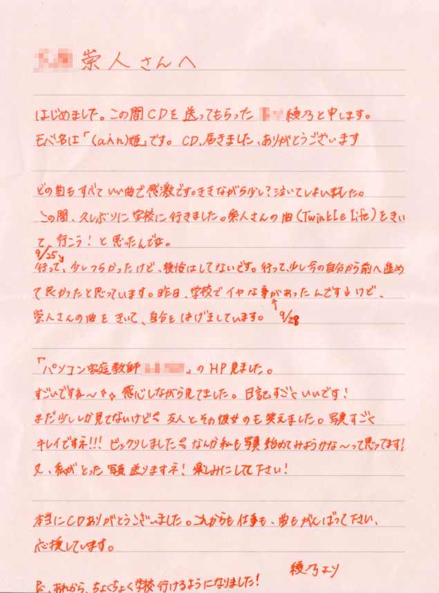 私が送ったCDを聴いて不登校だったコが頑張って学校に行くようになってくれたり、
