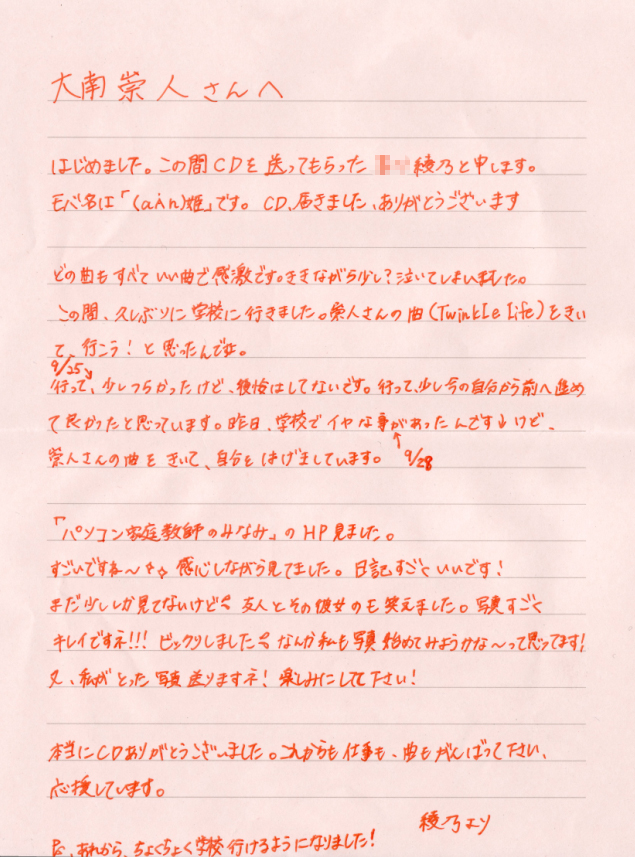 ●ファンのコからの手紙。兵庫県に住む不登校の14歳中学生の女の子。。。