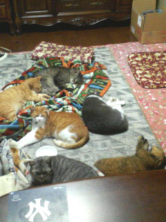 下記、画像6匹のネコたちはホットカーペットでゴロゴロ中(゜▽゜)!!可愛いですね☆