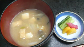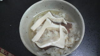 朝ごはんはハムエッグと湯豆腐。松茸は漬物みたいな感じのものがございました。